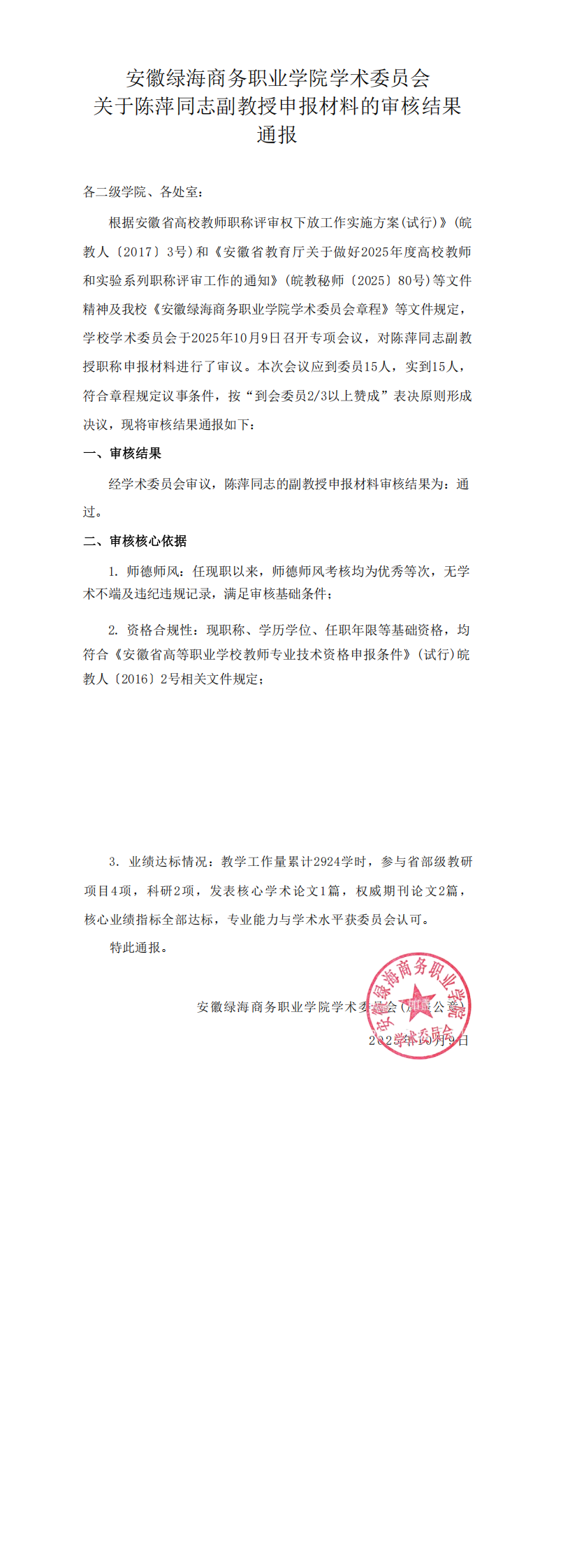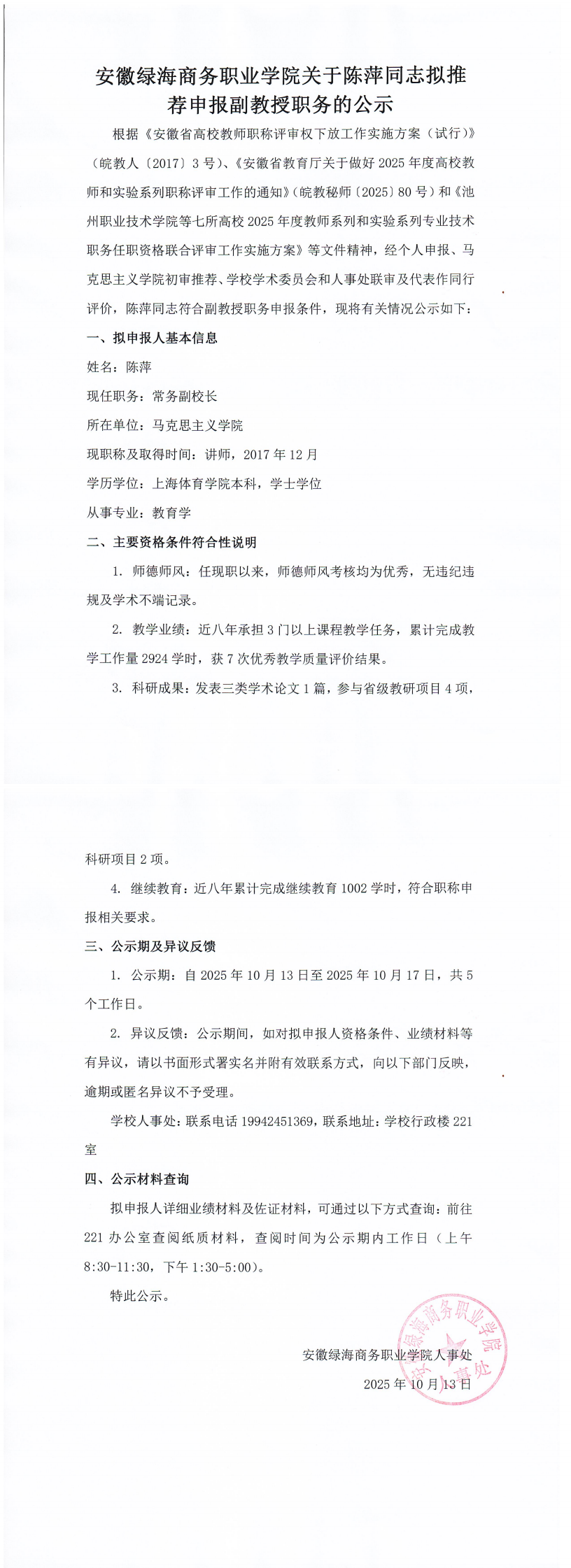 根据《安徽省高校教师职称评审权下放工作实施方案(试行)》(皖教人〔2017〕3号)、《安徽省教育厅关于做好2025年度高校教师和实验系列职称评审工作的通知》(皖教秘师〔2025〕80号)和《池州职业技术学院等七所高校2025年度教师系列和实验系列专业技术职务任职资格联合评审工作实施方案》等文件精神,经个人申报、马克思主义学院初审推荐、学校学术委员会和人事处联审及代表作同行评价,陈萍同志符合副教授职务申报条件,现将有关情况公示如下: