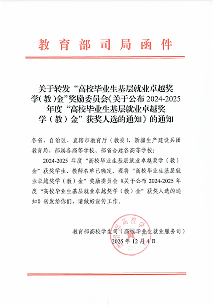 “高校毕业生基层就业卓越奖学(教)金”由教育部高校学生司(高校毕业生就业服务司)、教育部学生服务与素质发展中心共同指导,中国长江三峡集团有限公司出资,中国教育发展基金会特设,奖励赴基层就业并做出突出业绩的普通高校毕业生,以及指导服务大学生赴基层就业工作有突出贡献的教师,具有极高的权威性与影响力。2024—2025年度“高校毕业生基层就业卓越奖学(教)金”共奖励学生418人、教师58人。其中安徽17名学生,3名教师入选。