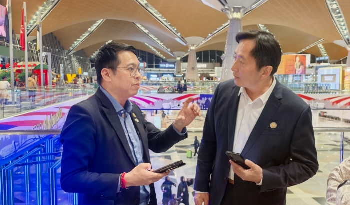 在接机仪式后,陈孝云主席与李泰康局长进行了简短的交谈。陈孝云主席表示,很高兴应邀参加首航接机仪式,直航的开通,无疑为两地在旅游、商贸、游学以及企业出海等诸多领域带来了前所未有的发展机遇。他着重向李泰康局长汇报了吉隆坡科技大学的办学情况,以及近期大学与北京非物质文化遗产发展基金会共同筹备设立吉隆坡科技大学世界非物质文化遗产中心、世界非物质文化遗产学院、世界非物质文化遗产博物馆的发展愿景和思路。李泰康局长表示,通过此前几次会面,他对吉隆坡科技大学和陈孝云主席印象深刻。他指出,大学的地理位置优越,周边高校云集,自己几次路过大学时,较大的校园规模、丰富的办学内涵,让他记忆犹新。当谈到非物质文化遗产中心建设时,他随即嘱咐身边人员,吉科大在此过程中若有需要支持时,可与旅游局有关部门深入沟通交流,以便给予更有力的服务与保障。