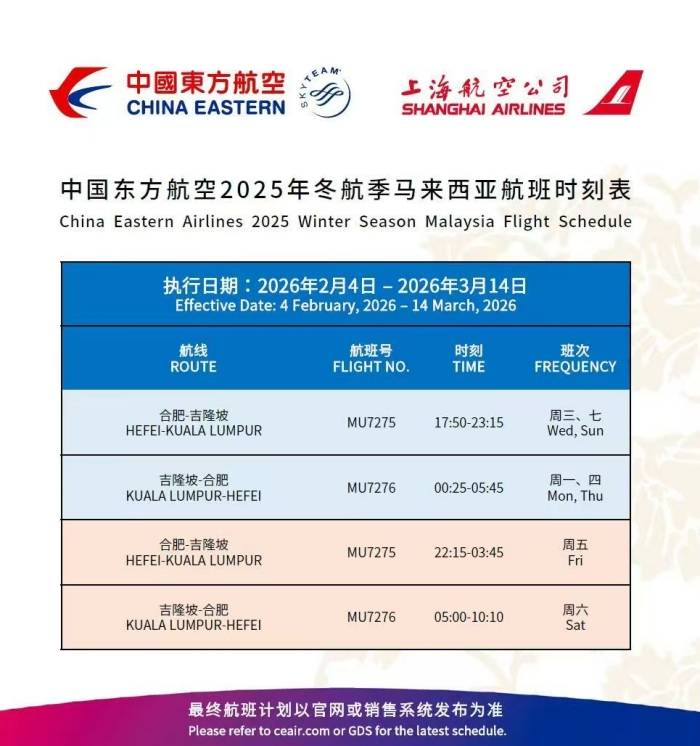 此次直航的开通,是落实中马两国深化合作共识的具体行动,也是安徽扩大对外开放、提升枢纽能级的又一成果。航线由东航安徽分公司空客A320机型执飞,目前计划每周往返,为两地旅客提供了高效便捷的出行选择,尤其将有力促进春运及日常的探亲、旅游与商务往来。