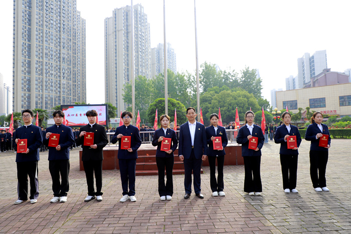 榜样引领前行,青春绽放荣光。仪式现场举行隆重的五四星青年标兵颁奖仪式。陈老师依次为吴巍冉、李新杰、梁爽、黄颖、李绍涵、翟鸿浩、张世茜、金明珠、王婧九位获奖学子颁奖,勉励他们珍惜荣誉、再接再厉,发挥模范带头作用,带动更多同学奋勇争先、成长成才。全场师生以热烈掌声向受表彰同学表示祝贺。