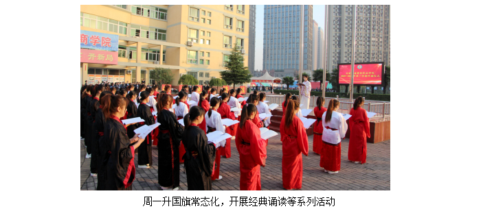 大力建设“三堂”“三坛”两大平台。“三堂”包括大师讲堂、国学讲堂、“商道”创新创业讲堂。“三坛”包括社会主义价值观教育论坛、创新创业论坛、职业教育论坛。