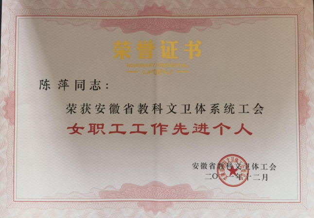 为表彰先进,树立典型,引领全省各级工会女职工组织和广大女职工工作者立足岗位创先争优,刚刚结束的安徽省教科文卫体工会女职工委员会成立暨一届一次全委(扩大)会议,表扬了一批深受广大职工群众信赖和赞誉的工会女职工先进集体和先进个人,我院工会女工委员会荣获“安徽省教科文卫体系统工会女职工工作先进集体”荣誉称号,陈萍同志荣获“女职工工作先进个人”荣誉称号。学院工会女工委主任任婷婷同志代表学院工会参加会议并领取省教科文卫体工会授予的两项奖励。