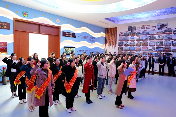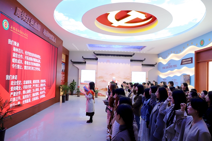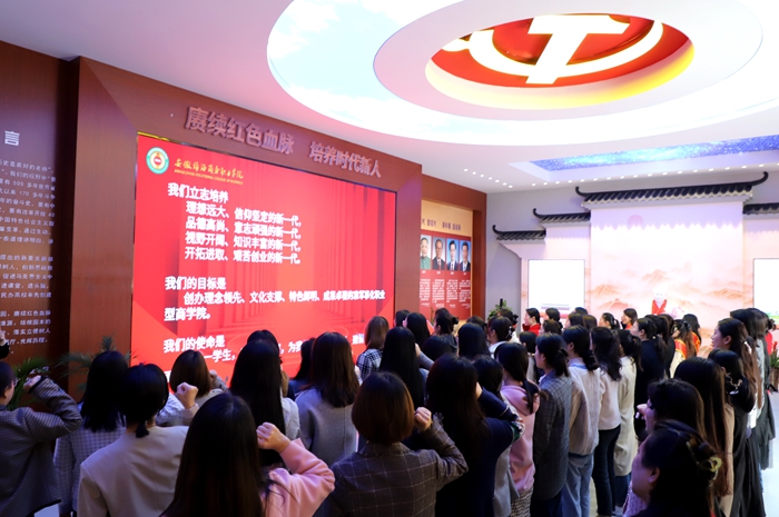 校长助理郝欣富教授带领女教职工代表参观党建馆并进行解说,党史馆内按照历史脉络和时间顺序,充分展示了近百年我们党团结带领全国人民坚守初心使命、不断开拓前行的光辉历程,让各位教职工更充分的了解党的光辉历史。在教师代表黄松和吴艺妮的领誓下,参与活动的教职工齐诵《教师宣言》。