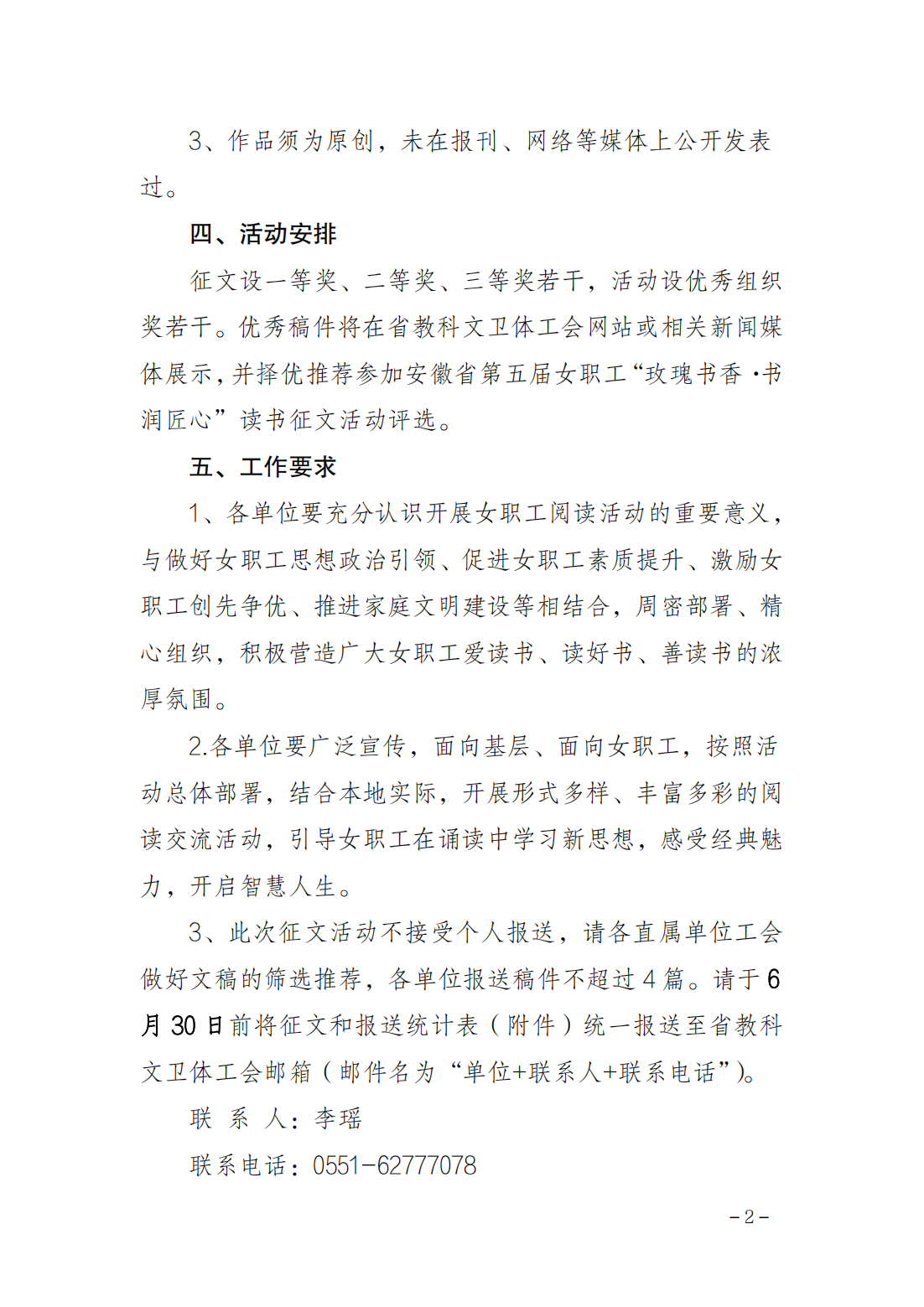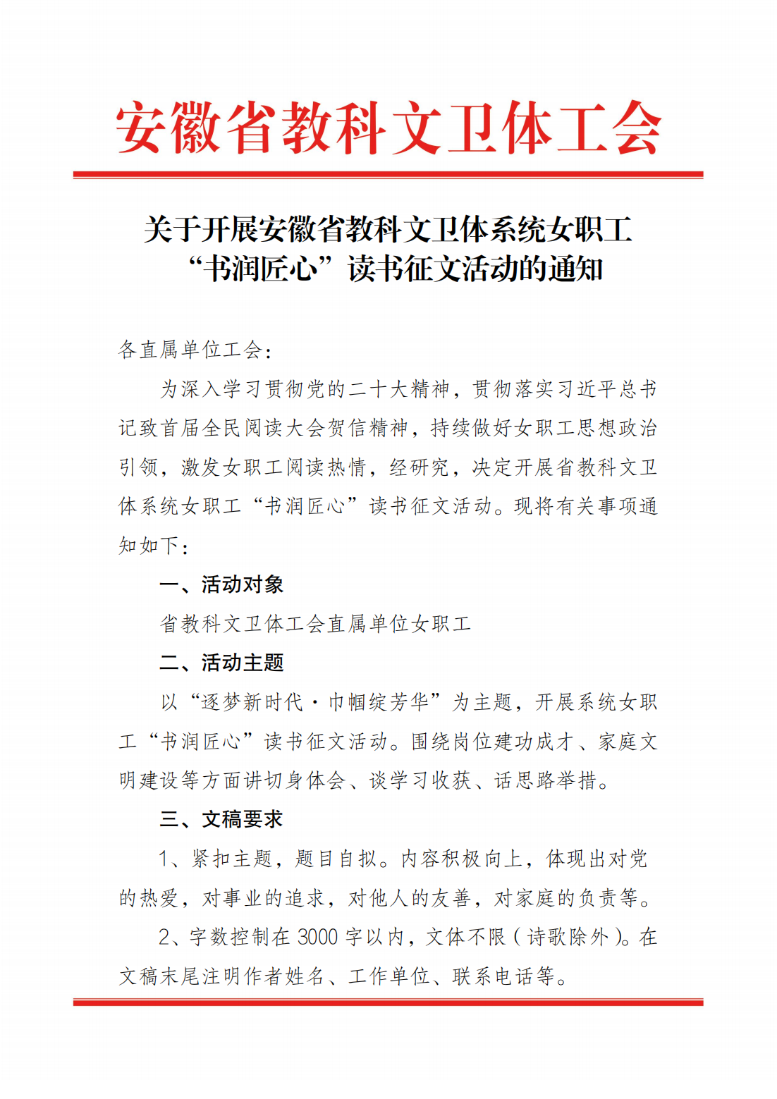 关于开展安徽省教科文卫体系统女职工 “书润匠心”读书征文活动的通知