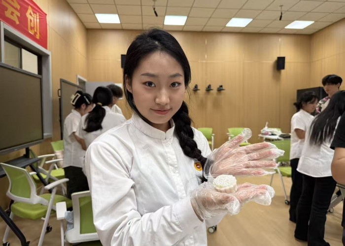 随着制作指令下达,现场瞬间热闹起来。揉面、包馅、压模,师生们分工协作、相互讨教。有的同学将豆沙馅、抹茶馅等细心包裹,用印有纹样的模具压出精致造型,呼应着中秋团圆的美好寓意;有的师生搭档创新手法,在饼皮中融入创意元素,让传统美食碰撞出别样火花。“这是我第一次做月饼,老师手把手教我收口技巧,感觉特别温暖。”一位参与学生的话语道出了众人的心声。搓揉间的专注、脱模成功的欢呼、相互展示成果的笑容,构成了科创馆内最动人的画面。