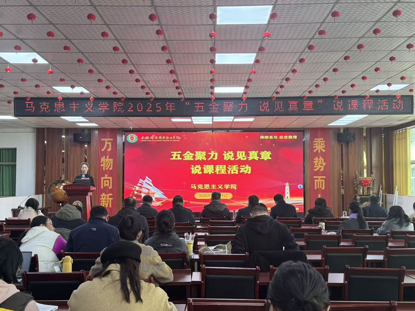 为深入贯彻落实学校教师队伍建设要求,助力学校“五金”建设发展战略,全面提升教师教学能力和专业素养,推动教学理念与方法创新。在教务处统一部署下、在学院专家团队的指导下,11月27日下午,马克思主义学院在图书馆二楼隆重举办2025年“五金聚力・说见真章”说课程比赛活动。学校相关职能部门负责人、马克思主义学院全体教师及部分师生代表到场观摩。校长助理、信息工程学院院长郭玉堂,校长助理、科学与艺术学院院长王庆茂,校长助理、信息工程学院副院长吴芳宜,教务长、数字商贸与直播学院院长姚如富,经贸旅游学院院长汪芳琳,工商管理学院院长陆新文,科研处处长陈辉、信息中心主任许乐灵等专家教授亲临现场指导。马克思主义学院院长喻小红、党支部副书记王俊及全体教师共同观摩学习。