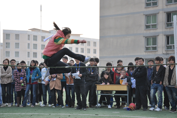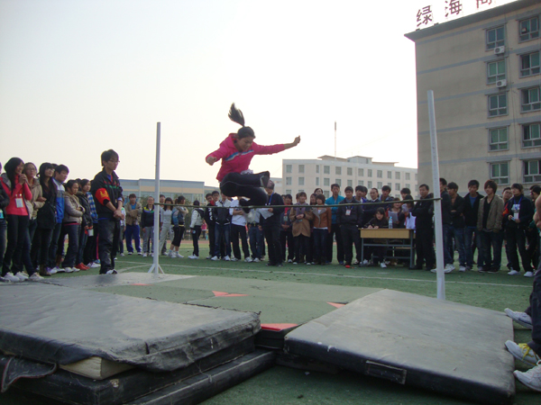 随着横杆的一步步升高,难度也越来越大。参赛选手都用尽全身力气,深呼吸,发力、助跑、侧身、起跳、腾跃,他身体宛如一条优美的弧线划过天空。突然,一个瘦弱的男生猛然飞跃了横杆却重重的倒在了地上。学生们都一拥而上,准备扶他。他却强忍着疼痛,自己站了起来。他那强忍着疼痛的表情深深映在了在场每一个人的心里。一次,两次,三次……直到最后一次,他都在空中划下了优美的弧线,却都在跃过横杆的那一刻重重的摔倒在地上。