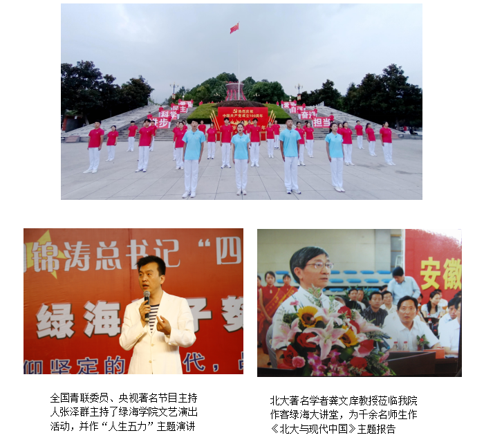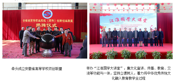 大力建设“三堂”“三坛”两大平台。“三堂”包括大师讲堂、国学讲堂、“商道”创新创业讲堂。“三坛”包括社会主义价值观教育论坛、创新创业论坛、职业教育论坛。