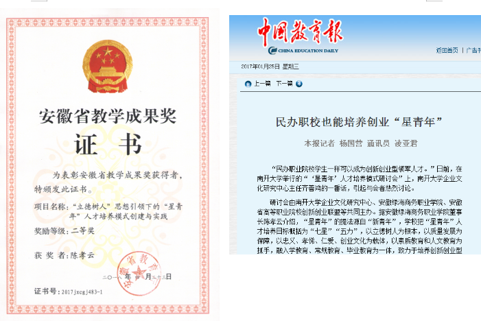 5.注重知识、文化、素质、特长教育与创新、创业、创造教育相结合。两个实训平台——“星青年”创业训练营和企业家《商道》特训营。在培训营中,专家带来精彩纷呈的报告,并指导模拟实训,从不同侧面对青年大学生创新创业的意义、方向、方法和路径给予面对面的指导训练。