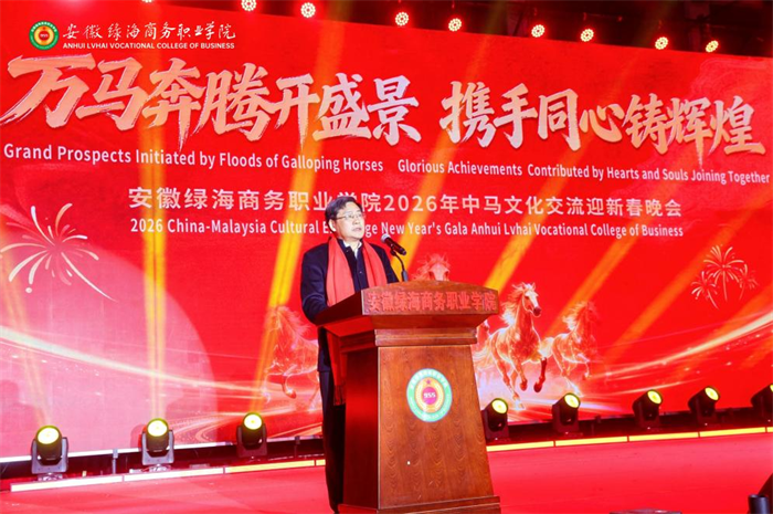 晚会伊始,绿海学院执行校长许信旺发表热情洋溢的新春致辞。他指出,这台晚会既是绿海学子青春风采的展示,也是中马教育合作深厚情谊的见证,更是两校深化合作、共促文明互鉴的生动载体。许信旺回顾了绿海学院2025年在党的建设、人才培养、科教协同与国际合作等方面取得的突破,特别强调与吉科大的合作标志着学校“职教出海”迈出关键一步。他寄语全体师生以“万马奔腾”之势,同心致远,为中马教育文化交流注入新活力。